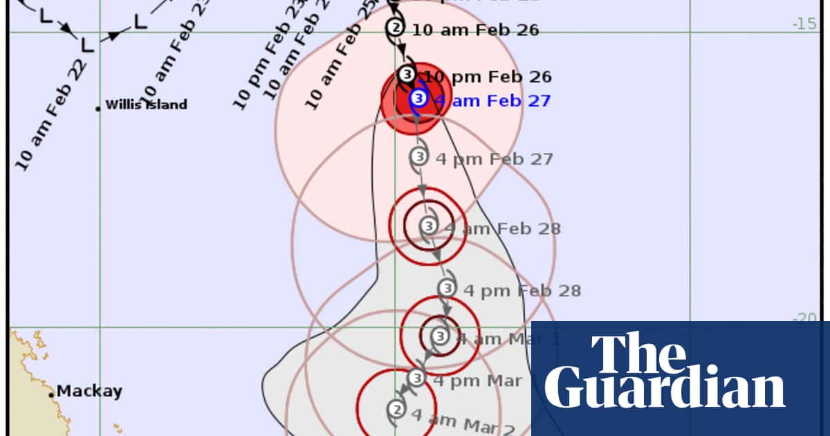 #theguardian.com. #Feb.26.2025 × Tropical Cyclone Alfred forecast: system intensifies to category three as it remains off Queensland coast. BoM tracking path of storm 850km north-east of Mackay and expected to cause powerful waves and winds on coast from Townsville down to K’Gari